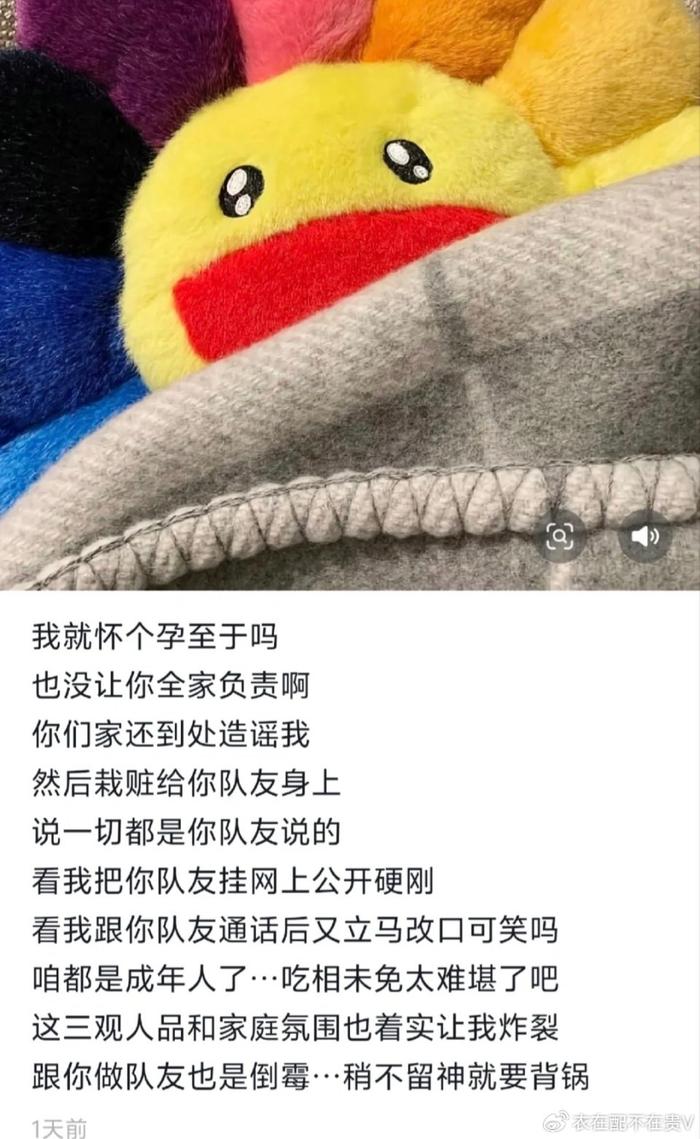 该女子表示,并未打算让胡颢瑀一家负责,但是男方母亲不承认自己怀孕,他的家长还到处造谣,甚至栽赃到男方的队友身上,被识破后又马上改口,吃相太难看,三观人品和家庭氛围非常炸裂。